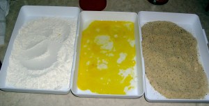 Wash off chicken breasts, beat eggs, dip the chicken in flour then the egg until coated, cover with cantadina bread crumbs, in a baking dish coat bottom of pan with sauce, place chicken in the pan cover with remainder of sauce, cover the dish with foil, place in the oven. Bake at 350 degrees for 1 hour. (last 5 minutes of baking top chicken with motz cheese.)