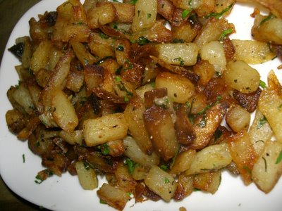 In a large skillet melt butter and add olive oil. Thinly slice the potatoes. Add chopped onion to the skillet and cook until caramelized. Add potatoes brown on both sides. Then add the salt and pepper and garlic powder to your liking. You can add fresh chopped parsley or fresh chives if you like also.