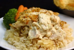 Mix cream of chicken soup and sour cream together. Pour over shredded chicken and mix that up. Pour it in to a 9×13 inch greased baking dish and sprinkle the top with the shredded cheese. In another bowl mix the crushed crackers with the melted butter and poppy seeds and spread on top. Bake at 350 degrees for 25-30 minutes. Serve over rice.