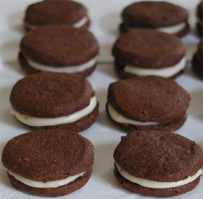 Mix the first 4 ingredients together in a mixer if you have one. Roll into small balls and bake them for 7-8 minutes on 350 degrees. Let cool and spread one cookie with a generous amount of frosting and top with another cookie.