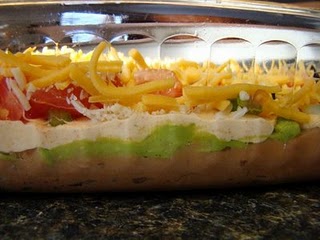 Spread the refried beans in a 9×13″ dish. Mash avocadoes and mix with guacamole mix. Spread guacamole over beans. Combine taco seasoning with sour cream and spread on top of guacamole. Top with cheese, tomatoes, and olives. Serve with corn chips.