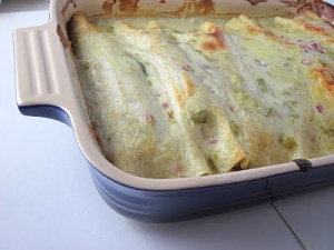 Fill each flour tortilla with the chicken mixture and roll up. Place seam side down in the prepared baking dish.