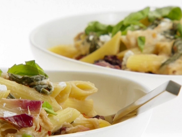 Transfer the penne to a large serving bowl. Top with the crumbled goat cheese, mix until the goat cheese in incorporated and garnish with basil.