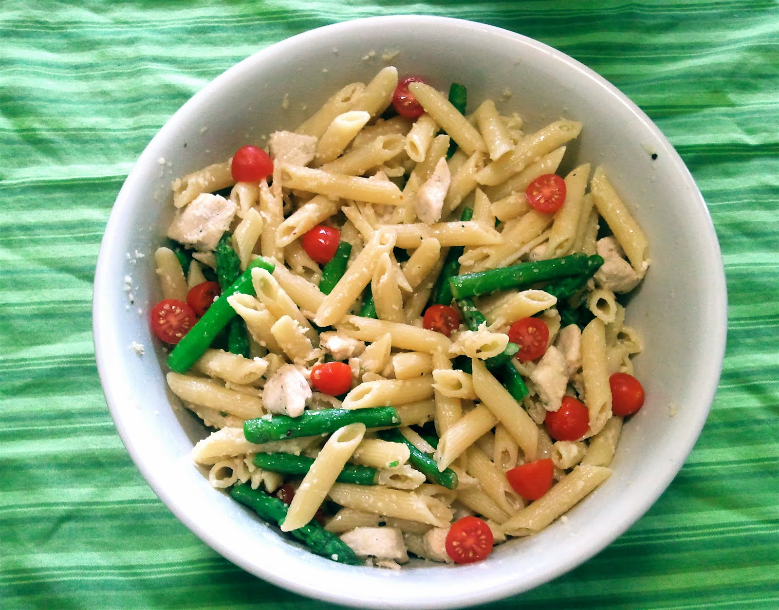 Boil your pasta according to directions. Heat 1 Tbs olive oil in a large skillet over medium heat. Saute chicken until firm and lightly brown, remove from pan and add remaining olive oil to skillet. Cook asparagus and red pepper flakes in oil until asparagus is tender add in the garlic last, so it doesn’t burn. Toss pasta with chicken and asparagus mixture, add in tomatoes. Sprinkle with parmesan cheese and serve warm.
