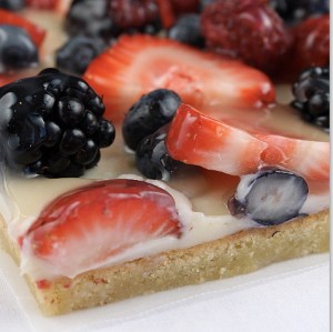 I love berry season! I can’t get enough of them. I have stocked up on strawberries so far this year, my kids love them and you can eat them with so many things. This weekend we decided to use some to make fruit pizza that I adapted from The Sisters Cafe website. It was delicious!