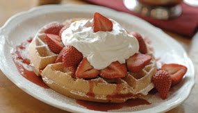 This was a delicious breakfast! We decided to serve them Bed and Breakfast style, with fresh strawberries, strawberry sauce, whipped cream and a little sprinkle of powdered sugar. Yummy!