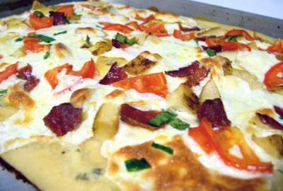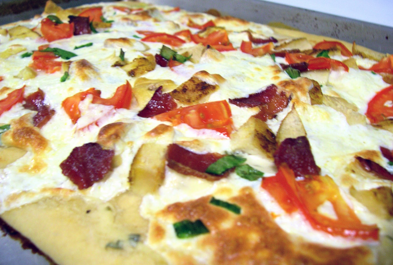 1 batch of your favorite pizza dough Mix ranch dressing and crushed garlic together then spread evenly on the pizza dough. Sprinkle a little cheese over the ranch dressing then add chicken and bacon. Sprinkle more of the cheese over that, add the tomatoes and green onions, then add the remaining cheese. Put in the oven at 400 degrees for about 12-15 minutes (or until crust is a nice golden-brown).