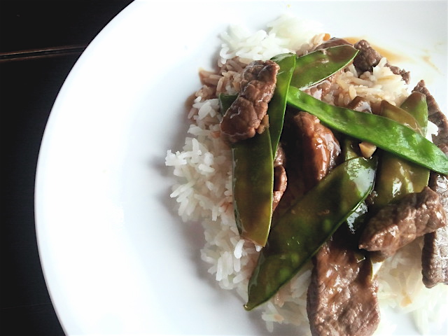 Heat oil in a wok or skillet over medium heat. Stir fry ginger and garlic for about a minute. Add the steak and fry for about 2 minutes or until browned. Add the snow peas and other veggies you want and fry for about 3-5 minutes. Add soy sauce mix and bring to a boil. Stir constantly. Lower the heat and simmer until the sauce begins to thicken. Serve with rice or Asian noodles