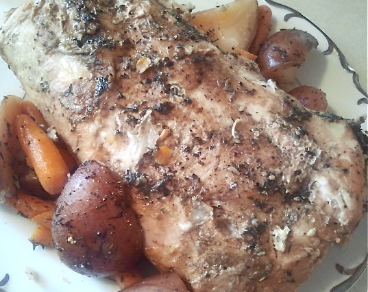 Mix thyme, sage, salt and pepper together and rub all over the roast. In a large skillet heat about 1 Tbs olive oil and brown each side of the roast, about 2 minutes per side. Place in a crock pot. Place carrots and potatoes on top and sprinkle with more salt and pepper to taste. (You can also sprinkle more sage and thyme for extra flavor on the veggies) Cover and cook on high for 6 hours.