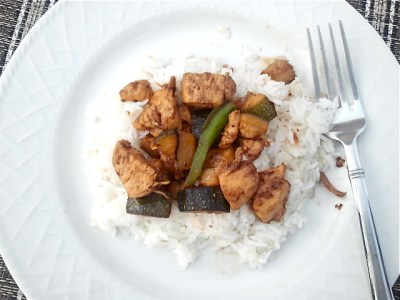 Add the zucchini and green pepper to the hot skillet and cook for 2-3 minutes, stirring often. Add soy sauce, vinegar, garlic and ginger. Stir to coat the vegetables and continue to cook until the peppers and zucchini are tender, 2-3 minutes. Add the chicken to the skillet and stir to combine and heat through. Serve over hot, cooked jasmine rice.