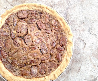 In a saucepan, melt the butter but don’t let it brown. Mix in the sugar and corn syrup and cook, stirring, over medium heat until the sugar dissolves. Stir in the vanilla and eggs. Mix well. Stir in the pecans. Pour into the pie shell and bake for 1 hour or until firm when shaken.