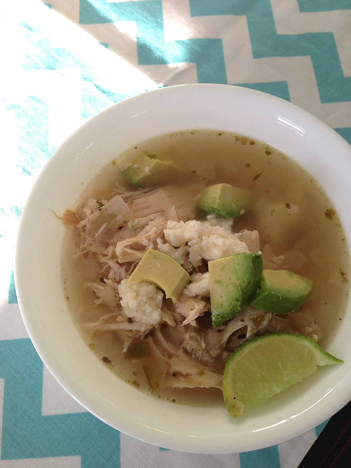 Juice as many limes as you need to, to get 1/4 cup fresh lime juice. Use the remaining limes for serving in your soup. season the chicken breasts with salt and pepper. In a large saucepan over medium heat, warm the olive oil. Add the chicken, and cook until brown on both sides, about 5 minutes. Transfer the chicken to a plate. Add the onions to the pan and saute until translucent, about 4 minutes. Add the garlic and chili and saute until fragrant, about 1 minute. Add the broth, water and lime juice and oregano, then return the chicken to the pan.
