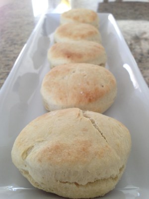 Preheat oven to 425 degrees. Combine flour, salt, sugar, baking powder, and butter until crumbly. Mix in the buttermilk, egg and just enough water to make a workable dough. Mix the dough until it is just barely combined (don’t over mix) Roll the dough onto a floured cutting board about 1 inch thick. Cut with a 2 inch biscuit cutter, or a 2 inch round cup. Place on a greased baking sheet and bake for 12-15 minutes.