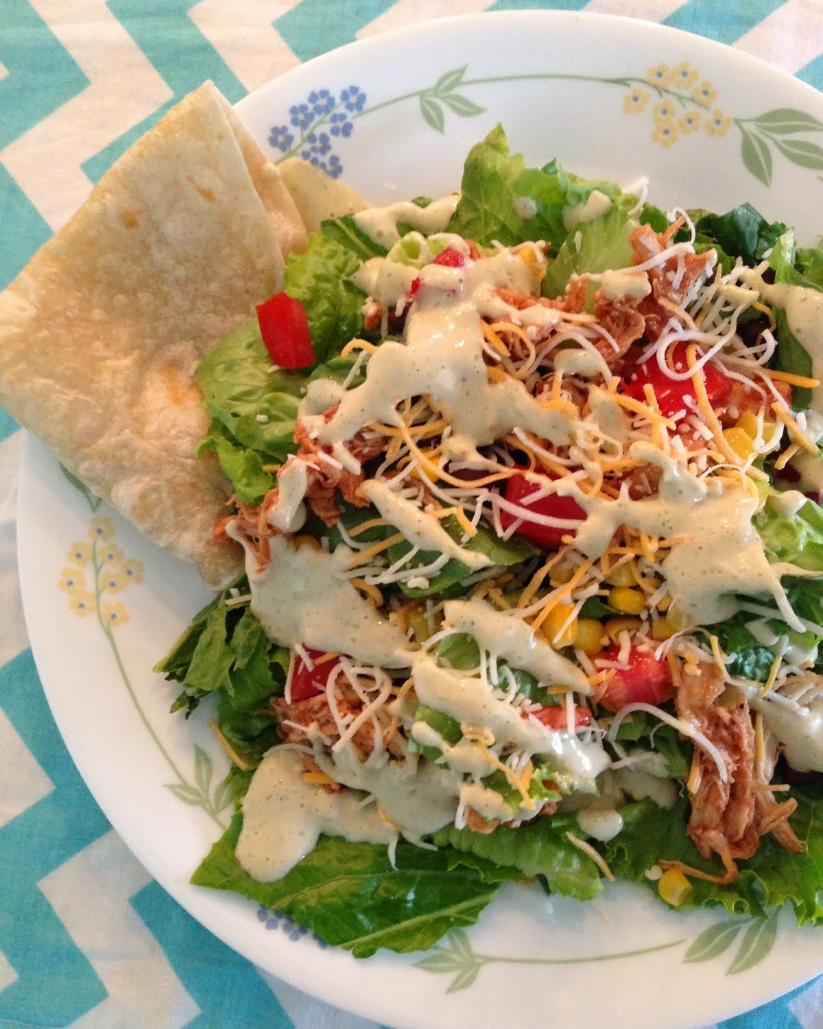 In a large bowl, toss together the iceberg lettuce, romaine lettuce, red onion, cilantro, corn, black beans and cheese. Toss the mixed salad with about 1/4 to 1/2 cup of the dressing, if desired. Otherwise, you can serve the dressing on the side. Place salad on plates and top with the prepared BBQ chicken and additional dressing.