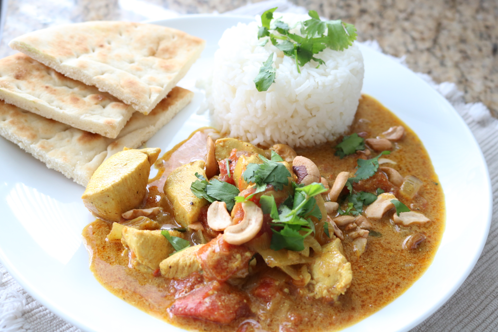 Garnish with cilantro, cashews and golden raisins. Serve with white rice and garlic naan.