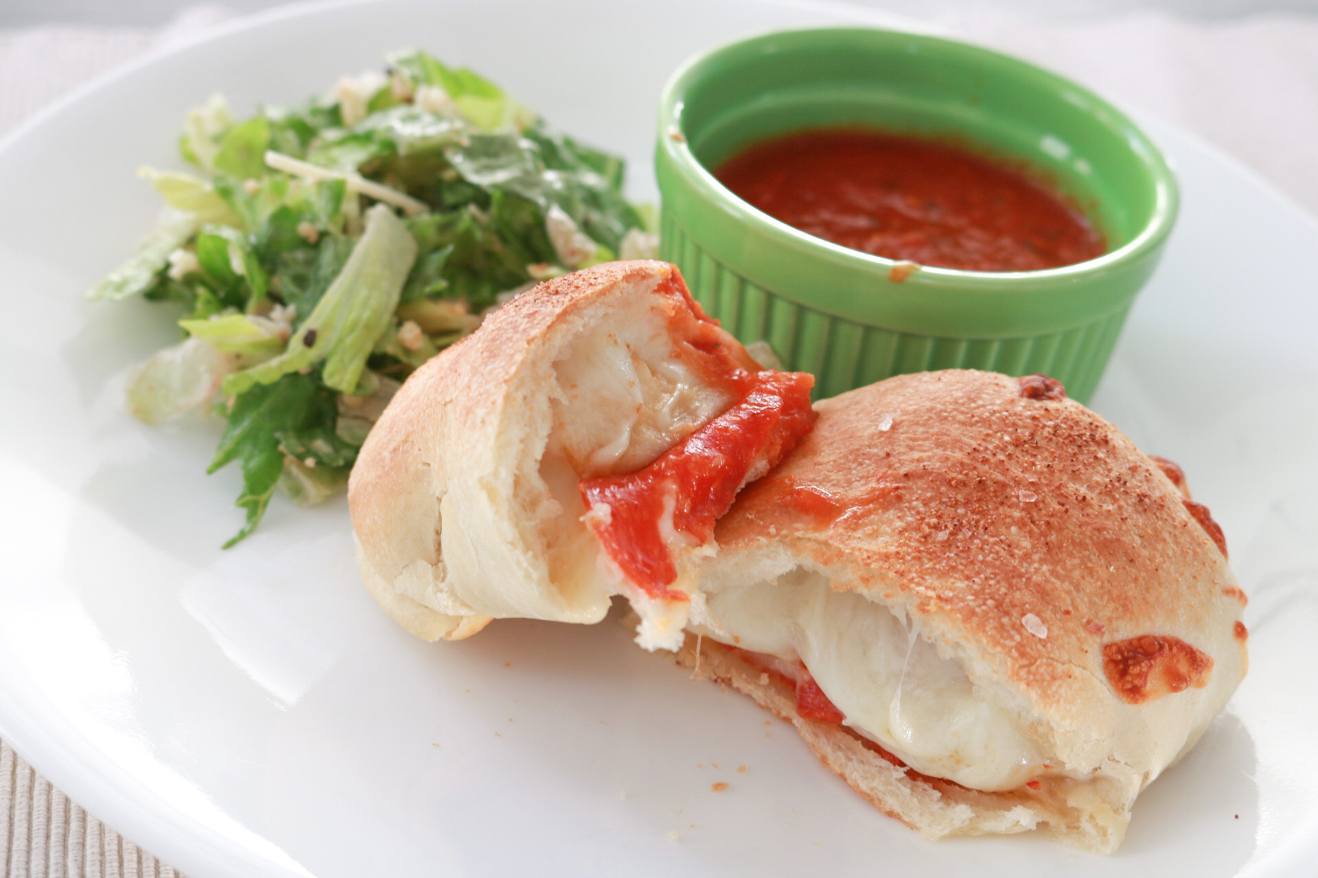 Tear off small sections of the dough and stretch each one out to about the size of your palm. Put in a small amount of mozzarella cheese, 1-2 slices pepperoni or whatever pizza toppings you like. Fold the dough and pinch the bottom to make a pocket. Brush the tops with olive oil and sprinkle with a little garlic powder and place on a lightly greased sheet pan bake at 500 degrees for 6-7 minutes.