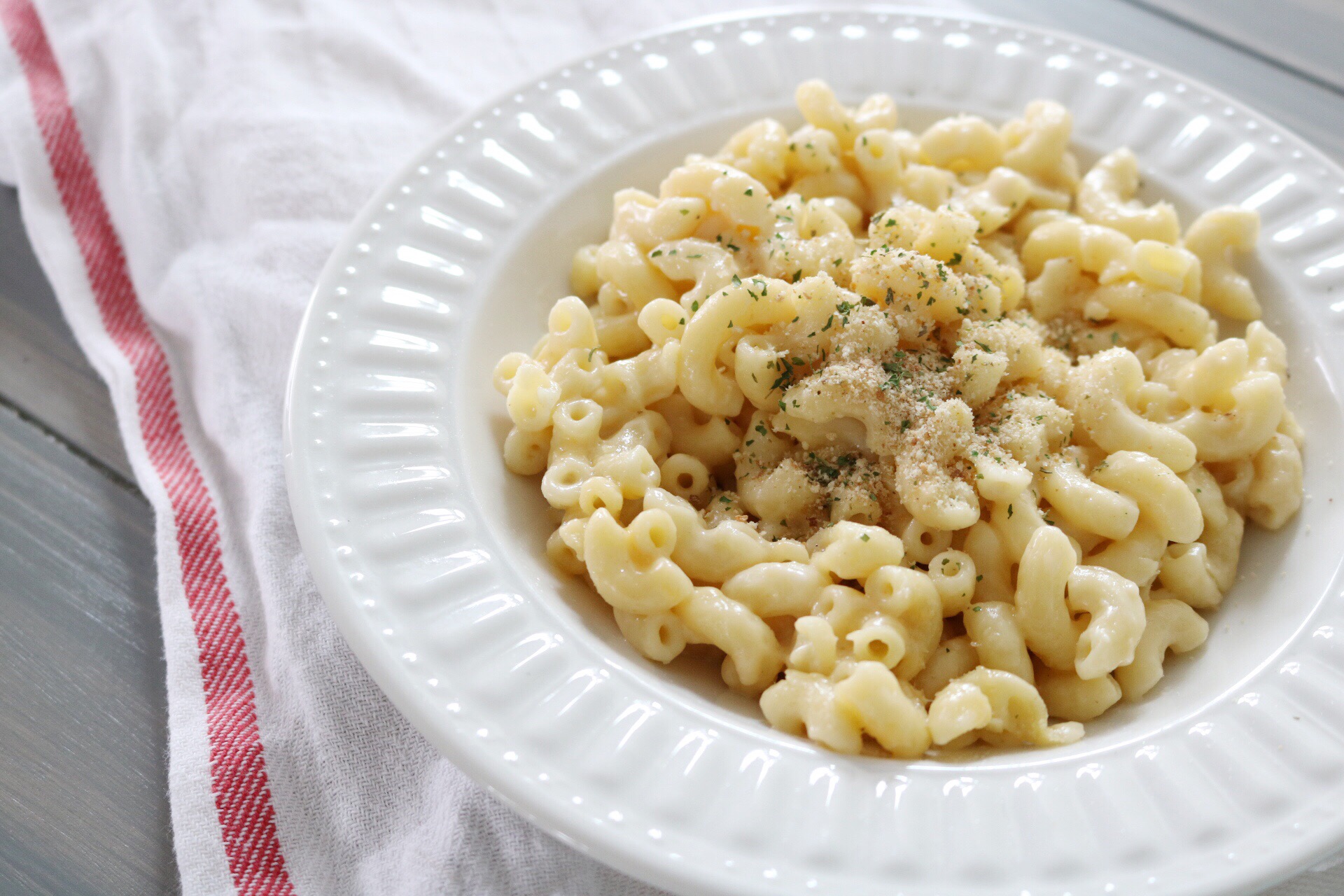 Add the milk and shredded cheese and continue to stir until all the cheese is melted and smooth. Top with grated Parmesan cheese and bread crumb topping.
