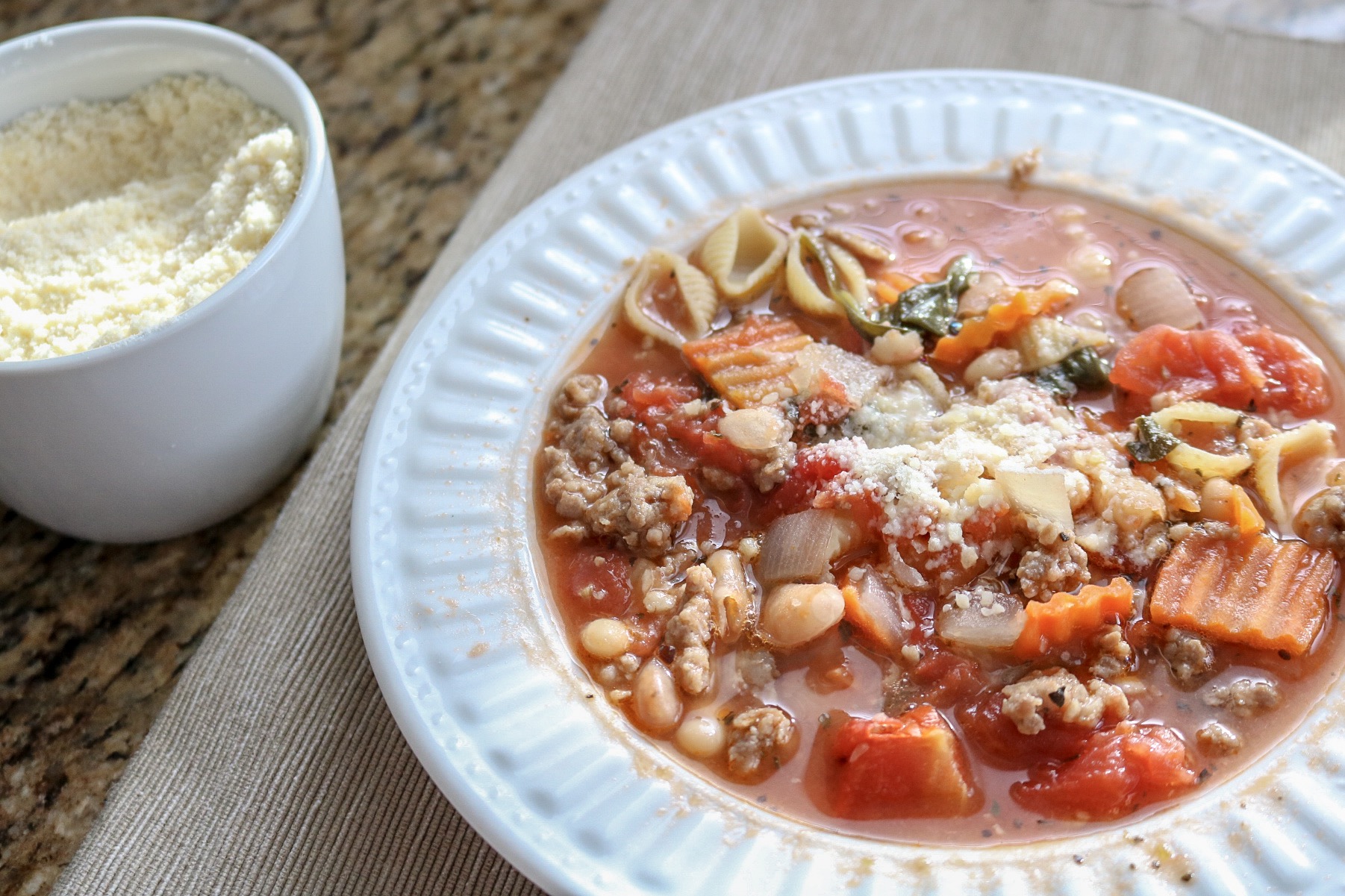 Stir in the spinach and simmer for another minute until the spinach is wilted. Serve sprinkled with Parmesan cheese.