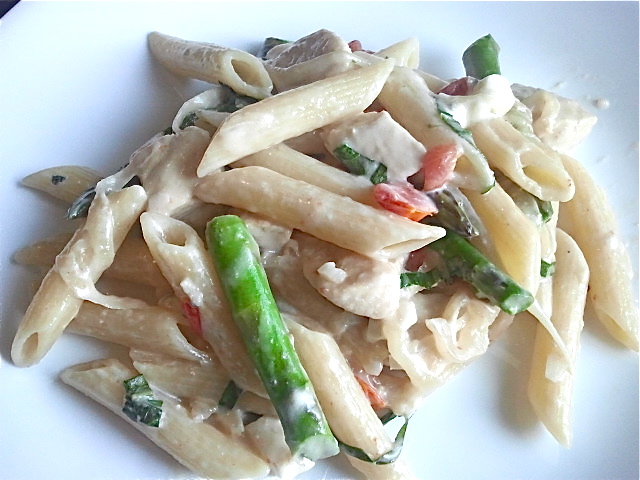 {Penne with Grilled Chicken, Gorgonzola, Asparagus and Caramelized Onions}